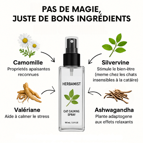 Oui. HerbaMist™ est formulé uniquement avec des ingrédients naturels, sans produits chimiques ni substances toxiques. Il ne contient ni alcool, ni huiles essentielles irritantes. Tous les composants sont 100 % sûrs pour une utilisation quotidienne auprès des chats.