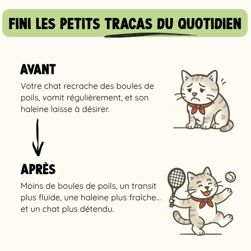 Une digestion plus fluide, moins de boules de poils coincées, et donc moins de vomissements et un meilleur confort digestif au quotidien.
