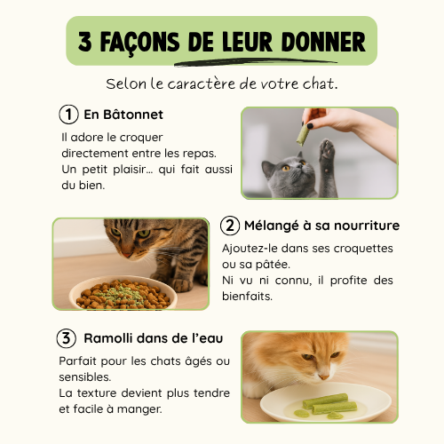 • Tel quel à croquer : idéal pour les chats gourmands. Il adore le mâcher comme une friandise.