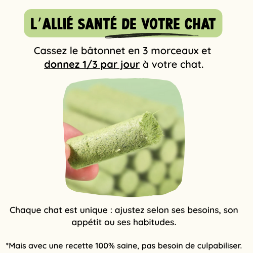 Nous recommandons 1/3 de bouchée verte par jour pour observer des résultats visibles. Mais chaque chat est unique : vous pouvez ajuster en fonction de ses besoins, de son appétit… ou de son plaisir !