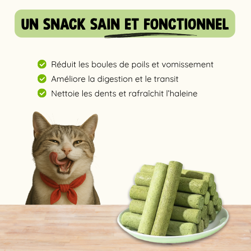 Un snack sain et naturel, conçu pour améliorer la digestion, l’hygiène bucco-dentaire et le bien-être quotidien de votre chat.