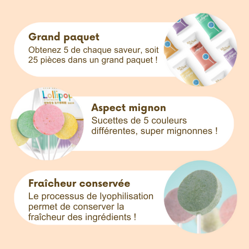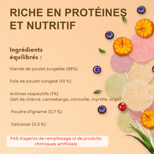 Chaque sucette est composée d’ingrédients nutritifs de haute qualité, riches en protéines.
